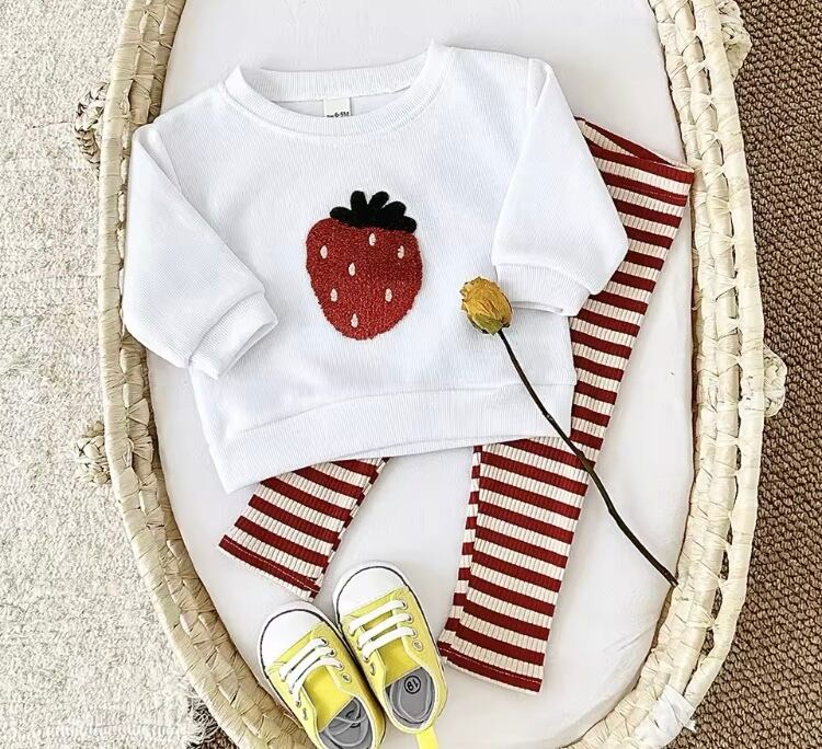 かわいらしいフルーツのデザインが目を引くベビーキッズ フルーツ上下は、おしゃれで快適なプルオーバーとボーダーパンツのセットです!お子様の個性を引き立てるカラフルなトップスは、楽しい日常を彩るアイテムとしてぴったりです♬ 軽やかな素材を使用しているため、動きやすく、遊びやお出かけにも最適な着こなしを実現します。