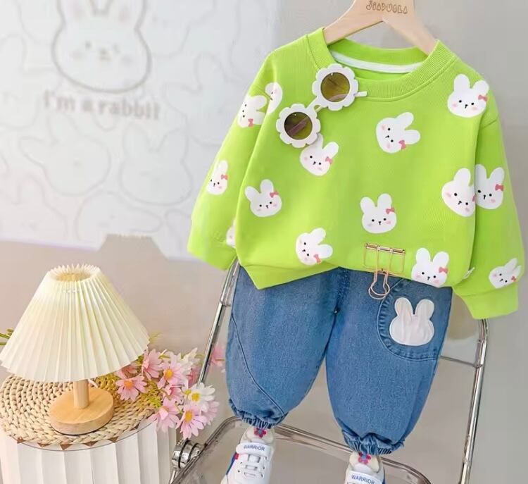 カジュアルでかわいらしい、ベビーキッズ 上下セットです!柔らかな綿素材を使用しており、肌触りが非常に優しいのが特長です♬ トップスには愛らしいくまさん柄と、うさぎさん柄が施されており、さらにジーンズにはワンポイントのデザインが加わっています。赤ちゃんのデリケートなお肌を包み込みながら、楽しい気分で着こなせるアイテムですので、ぜひお手元に迎えてください!