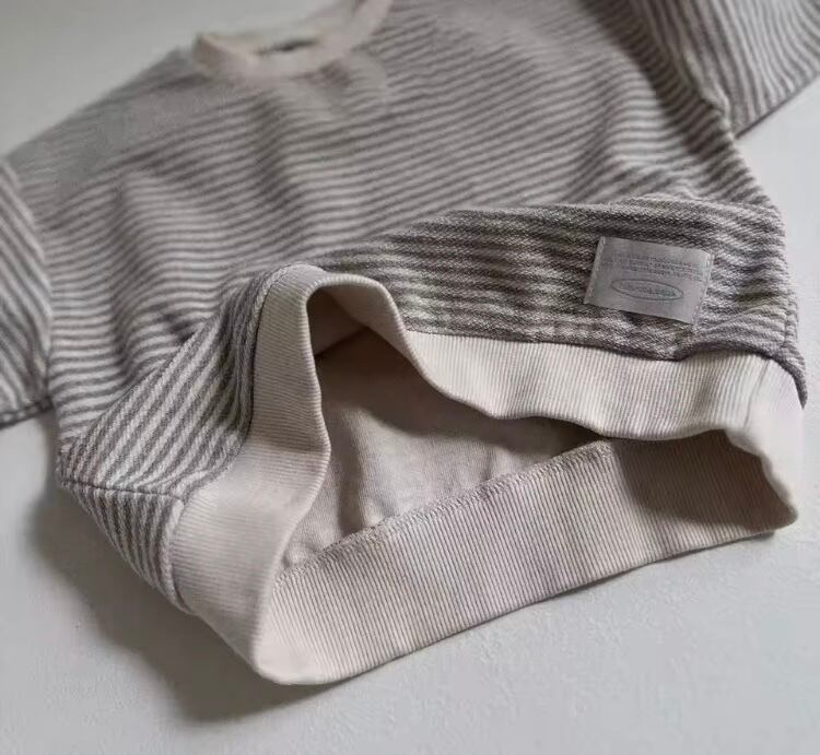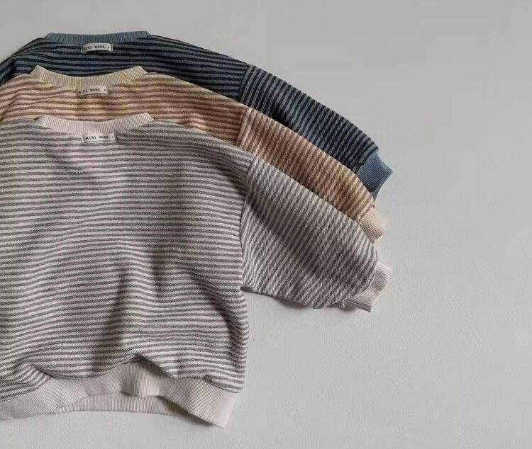 可愛らしさを大切にした、ベビー トップスです!コットン素材のスウェットを使用しており、カジュアルでルーズフィットなデザインが魅力的です♬ ボーダー柄がオシャレ度をアップさせ、お子さまの毎日をより楽しいものにしてくれます。動きやすさを重視した設計なので、遊びやお出かけにもぴったりです。このトップスをコーディネートに取り入れて、素敵な日々をお過ごしください!