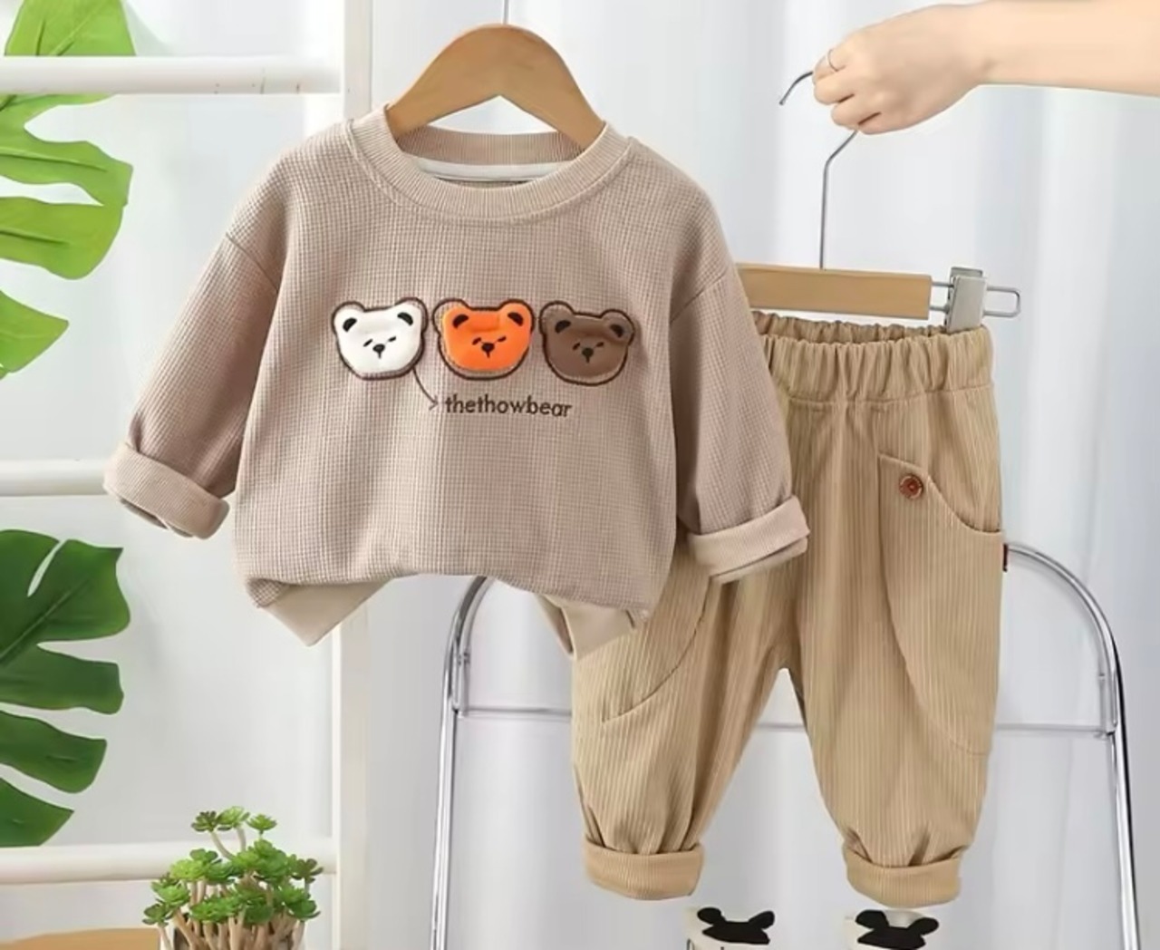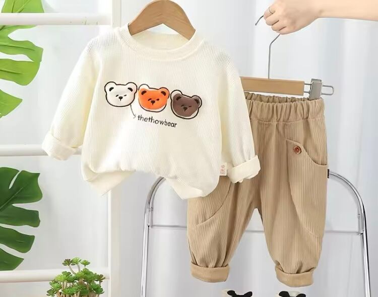 可愛らしさとカジュアルさを兼ね備えたアイテムです!ワッフル素材のパーカーが特徴的で、胸元には愛らしいくまさんの顔が3つデザインされています♬ お子さまの日常に楽しさをプラスしてくれる一着です。動きやすさを大切にした設計ですので、遊びやお出かけにも最適です。このセットをコーディネートに取り入れて、素敵な日々をお過ごしください!